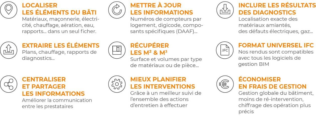 Concrètement, cette méthode de gestion numérique permet de récupérer en quelques clics toutes les informations du bâtiment : par exemple la localisation des équipements, les éléments de sécurité, les surfaces pour chiffrer des travaux, extraire des plans, des coupes et des élévations etc... Cette méthode de gestion est évolutive et pourra intégrer tous nouveaux équipements par la suite comme les résultats de diagnostics immobilier en incluant leurs références, dates d'intervention…