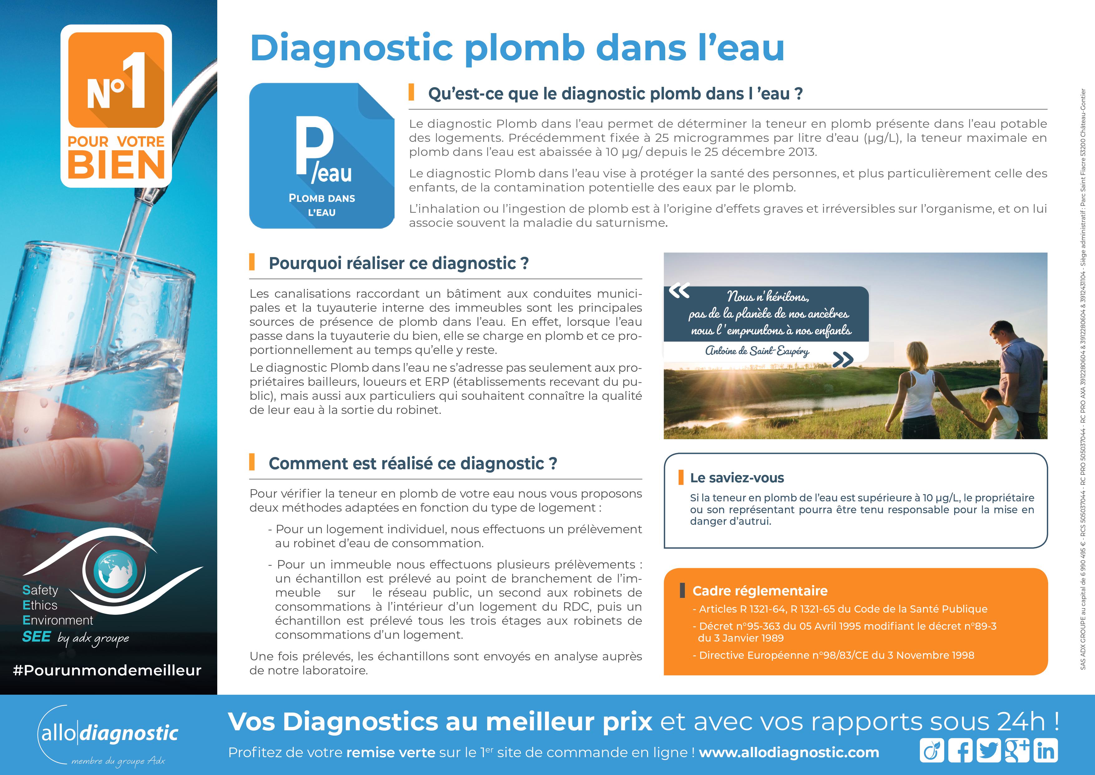 Le diagnostic Plomb dans l’eau est un diagnostic qui permet de déterminer la teneur en plomb présente dans l’eau potable des logements. Jusque là fixée à 25 microgrammes par litre d’eau (µg/L), la teneur maximale en plomb dans l’eau est abaissée à 10 µg/L à compter du 25 décembre 2013.